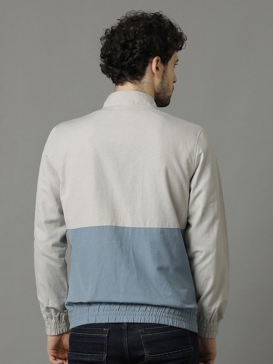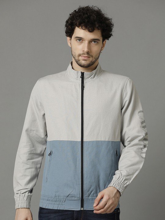 Grey & blue colourblocked lightweight bomber jacket, has a mock collar, 2 pockets ,has a zip closure, long sleeves, straight hemline, without lining engineered with antimicrobial