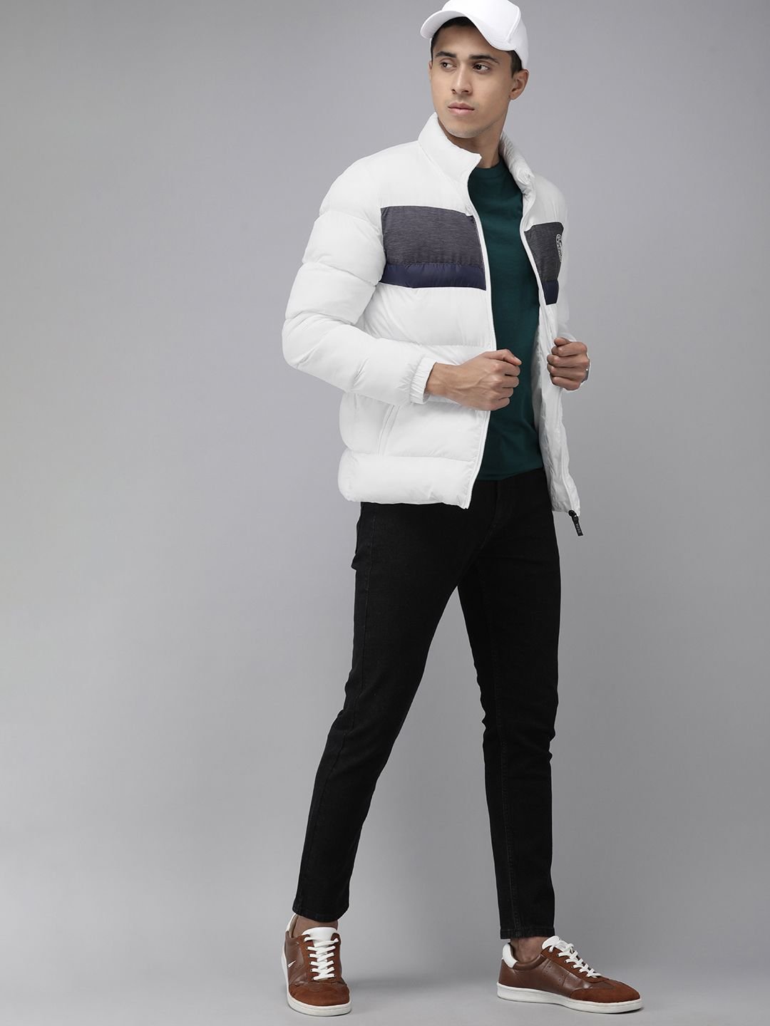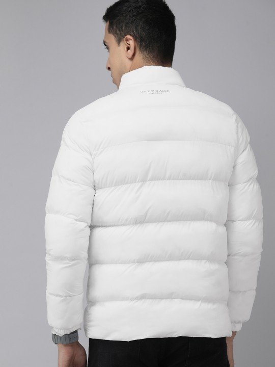 White & Grey colourblocked puffer jacket, has a mock collar, 2 pockets ,has a zip closure, long sleeves, straight hemline, polyester lining with attatched inner pocket