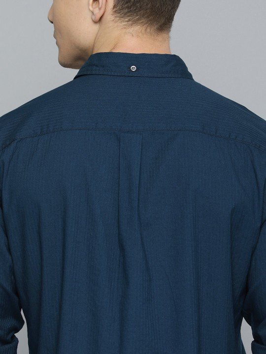 Blue dobby vertical striped opaque Casual shirt ,has a spread collar, button placket, 1 patch pocket, long regular sleeves, curved hem