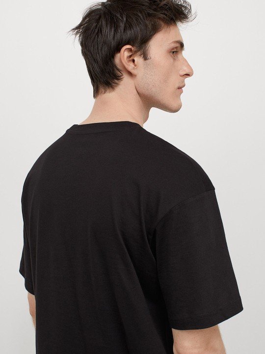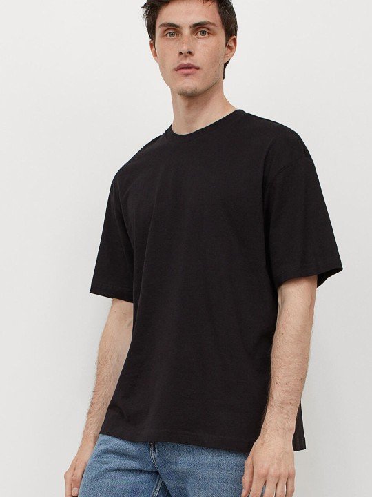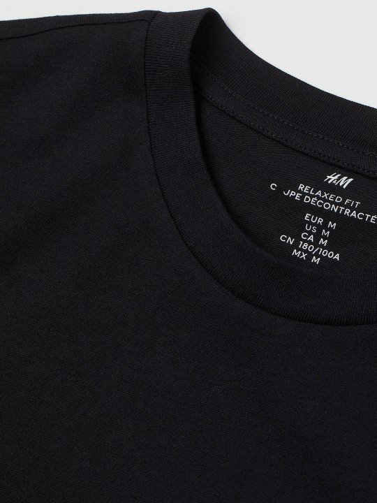 H&M Men’s Black Solid Relaxed Fit T-Shirt features pure cotton fabric, a sleek design, and unmatched comfort for effortless style.