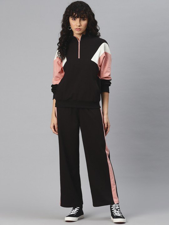 Laabha Colourblocked Sweatshirt with Flared Trousers offers trendy style, comfort, and a relaxed, fashionable fit.