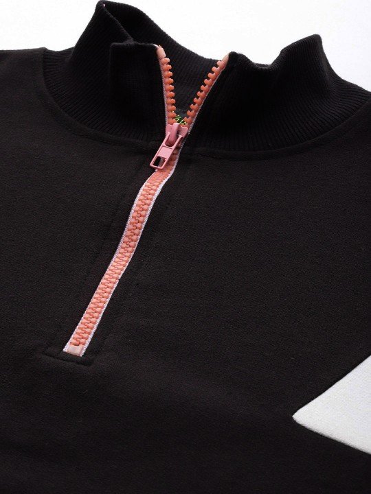Black, pink, and white colourblocked sweatshirt, has a stand collar with half zip closure, 2 pockets, long regular sleeves with ribbed cuffs, and ribbed hem