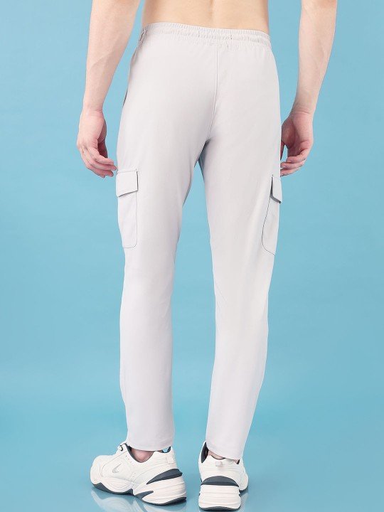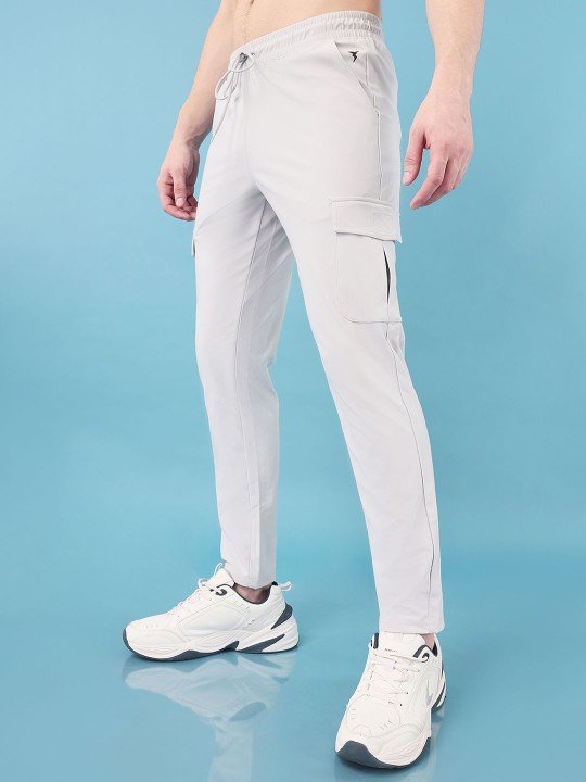 Light Grey solid slim fit mid-rise cargo track pants, has an elasticated waistband with drawstring closure and four pockets