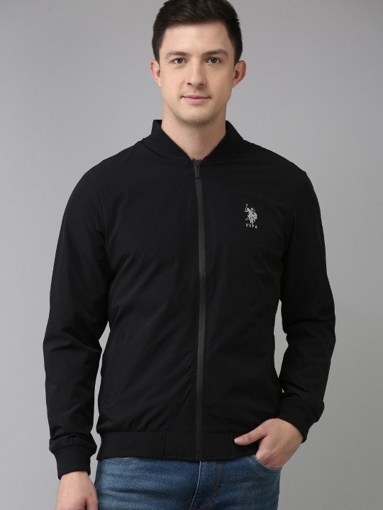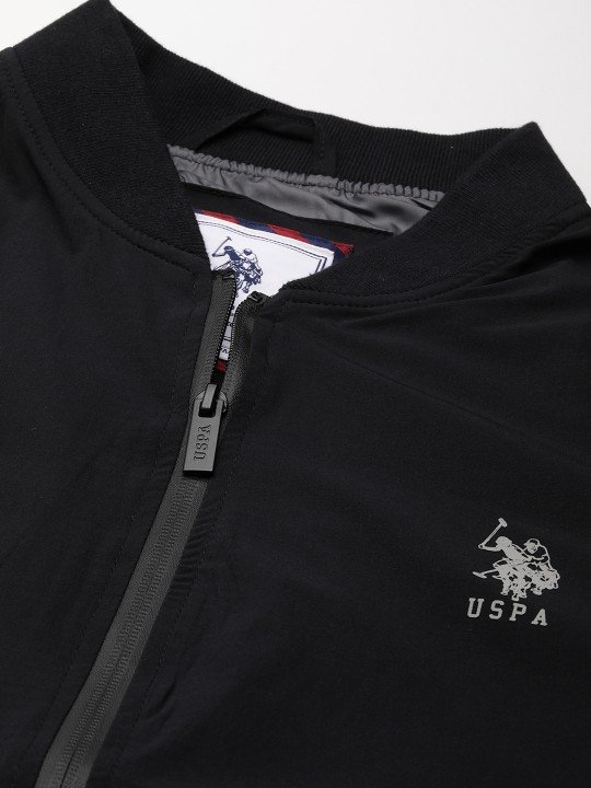 U.S. Polo Assn. Men Black Solid Brand Logo Bomber Jacket features a sleek design, comfortable fit, and iconic logo detail.