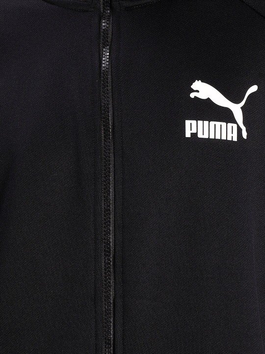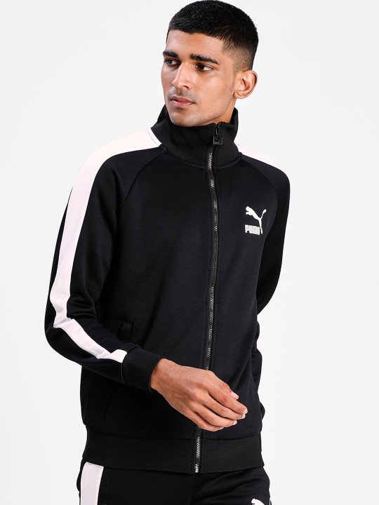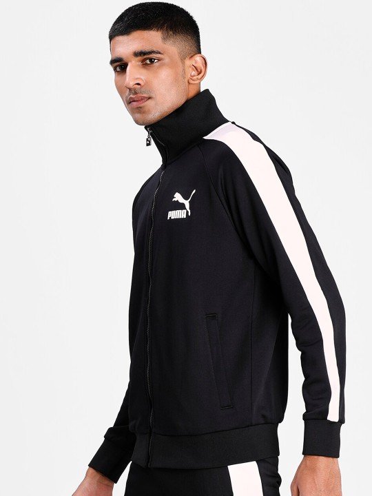 Puma Men’s Black Solid Iconic T7 Track Sustainable Jacket features eco-friendly fabric, iconic T7 design, and ultimate comfort for active wear.
