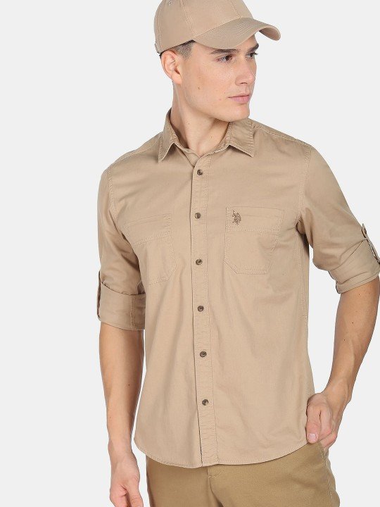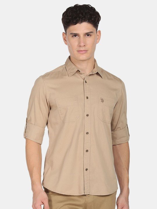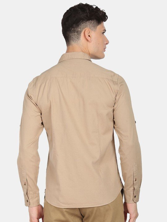 Beige solid opaque Casual shirt ,has a spread collar, button placket, 2 patch pocket, long roll-up sleeves, curved hem