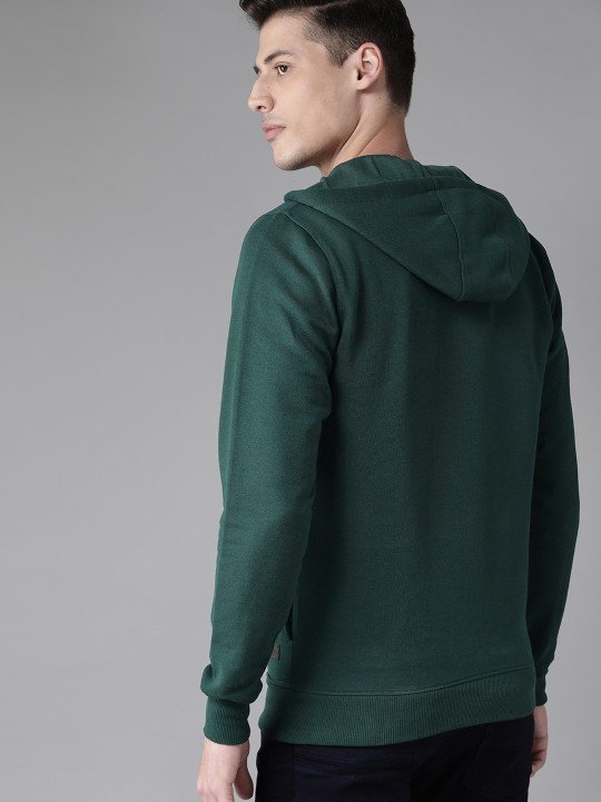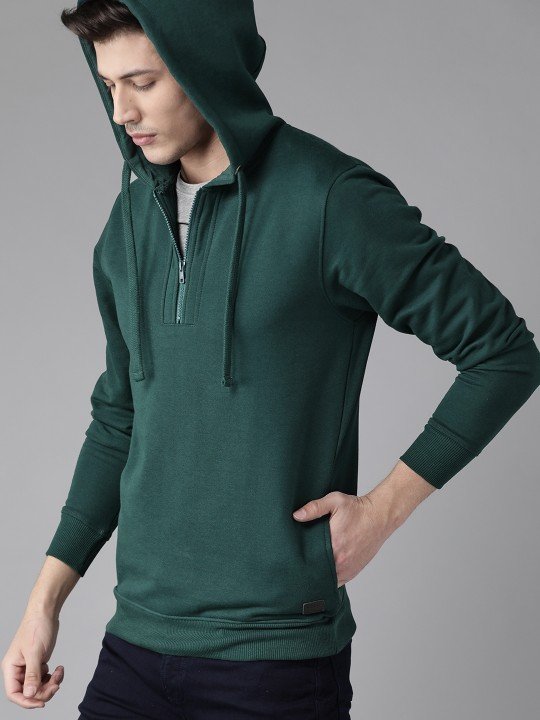 Roadster Men’s Green Solid Hooded Sweatshirt is trendy, offering a stylish, comfortable fit with a vibrant color for casual wear.
