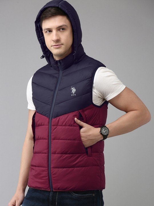 U.S. Polo Assn. Men Navy Blue Maroon Colourblocked Puffer Jacket offers a stylish colorblock design, warmth, and modern comfort for winter wear.