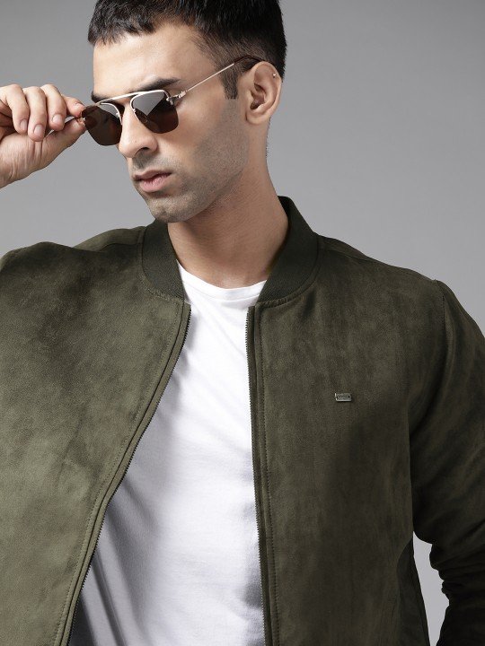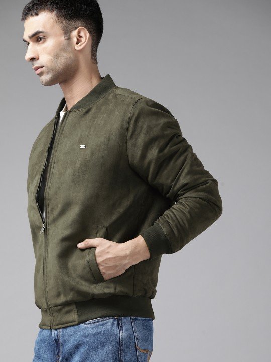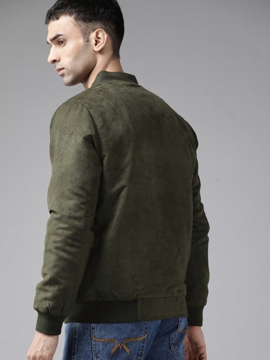 Roadster Men Olive Green Suede Finish Bomber Jacket features a stylish suede texture, modern design, comfortable fit, and versatile appeal.