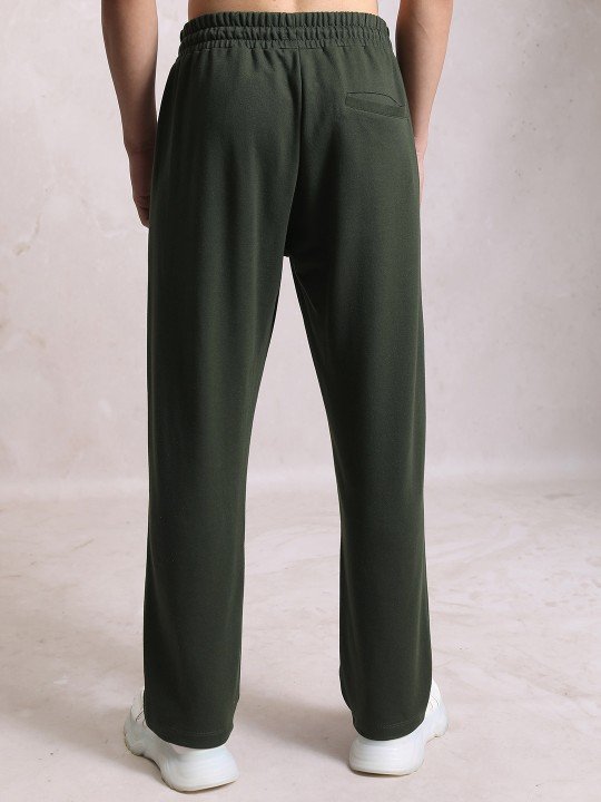 Olive solid relaxed-fit mid-rise track pants, has an elasticated waistband with drawstring closure and two pockets