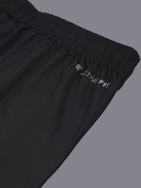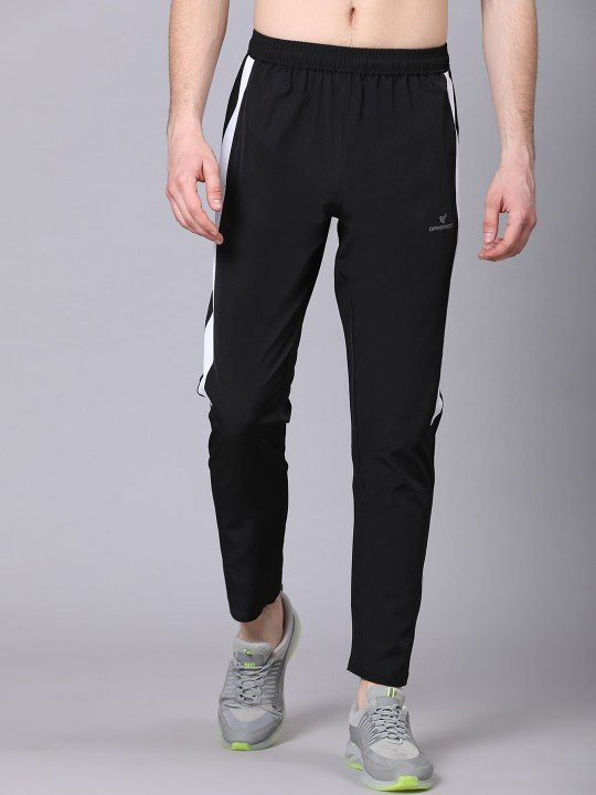 Black solid regular-fit track pants with white side stripe detail, has an elasticated waistband with a slip-on closure and three pockets