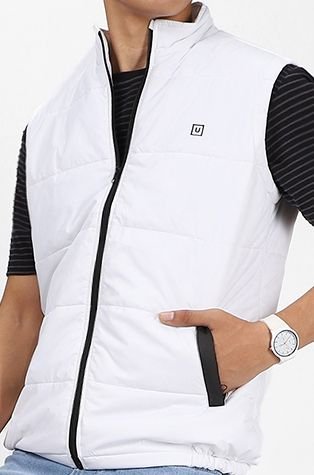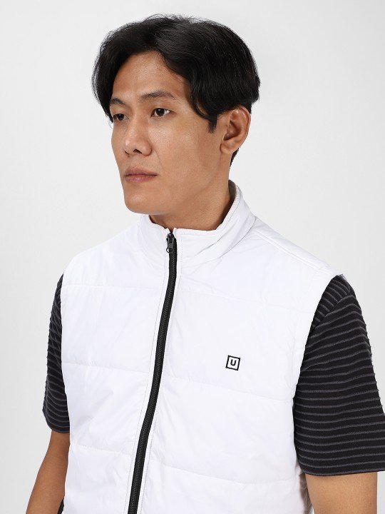 White solid jacket, has a mock collar, 2 pockets, zip closure, sleeveless, straight hem, and polyester lining