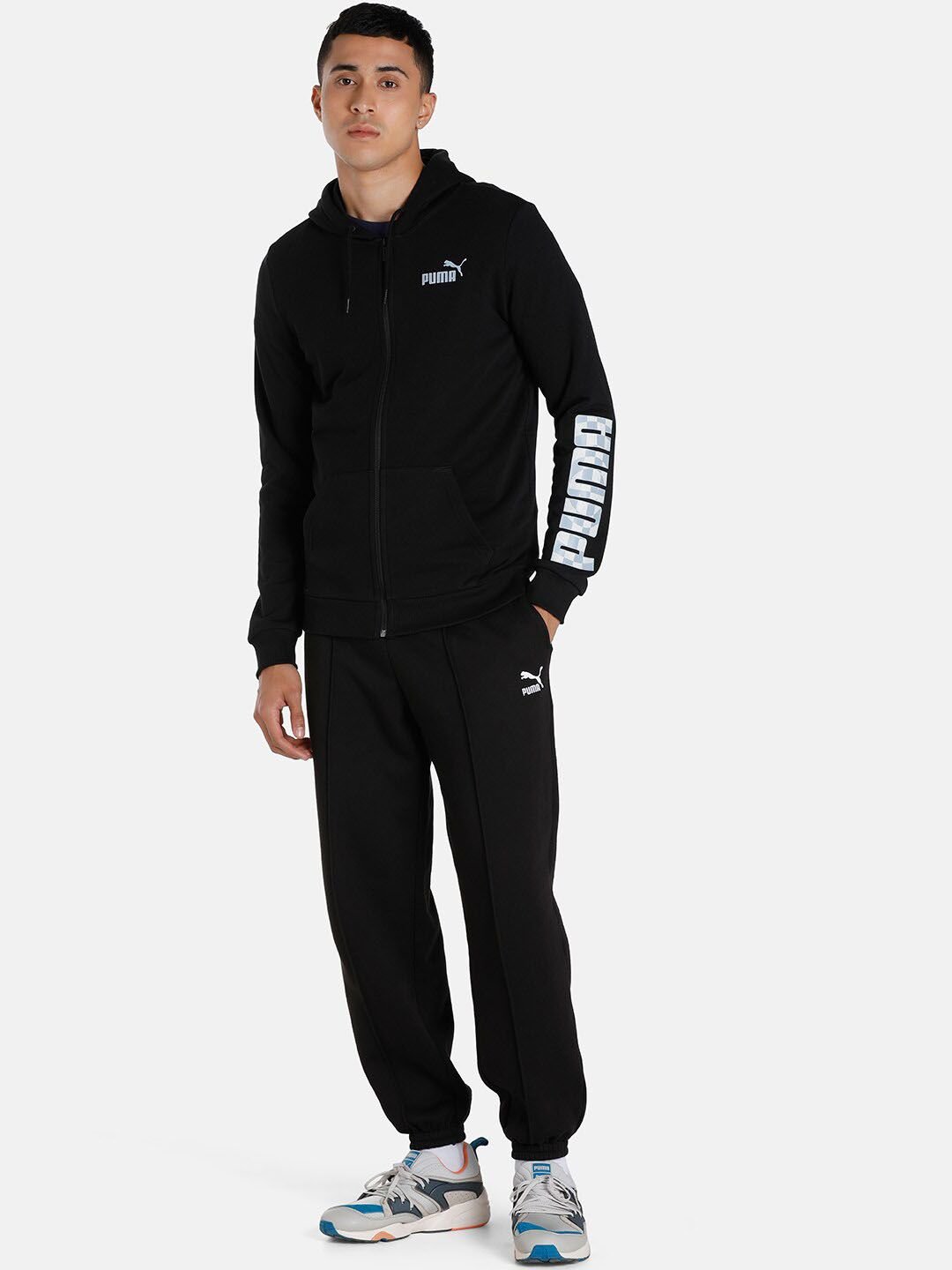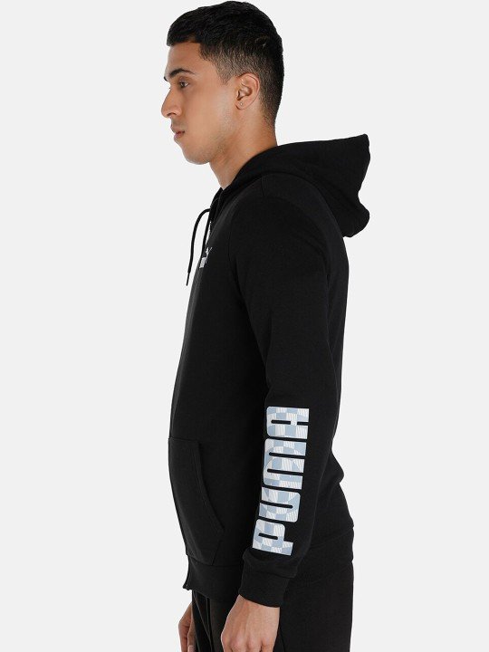 Black solid solid sporty jacket, has a hood, 2 pockets, has a zip closure, long sleeves, straight hemline, cotton lining
