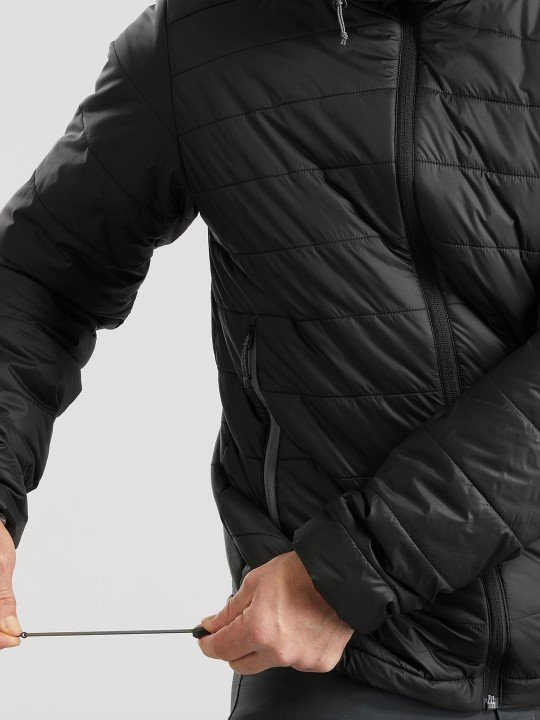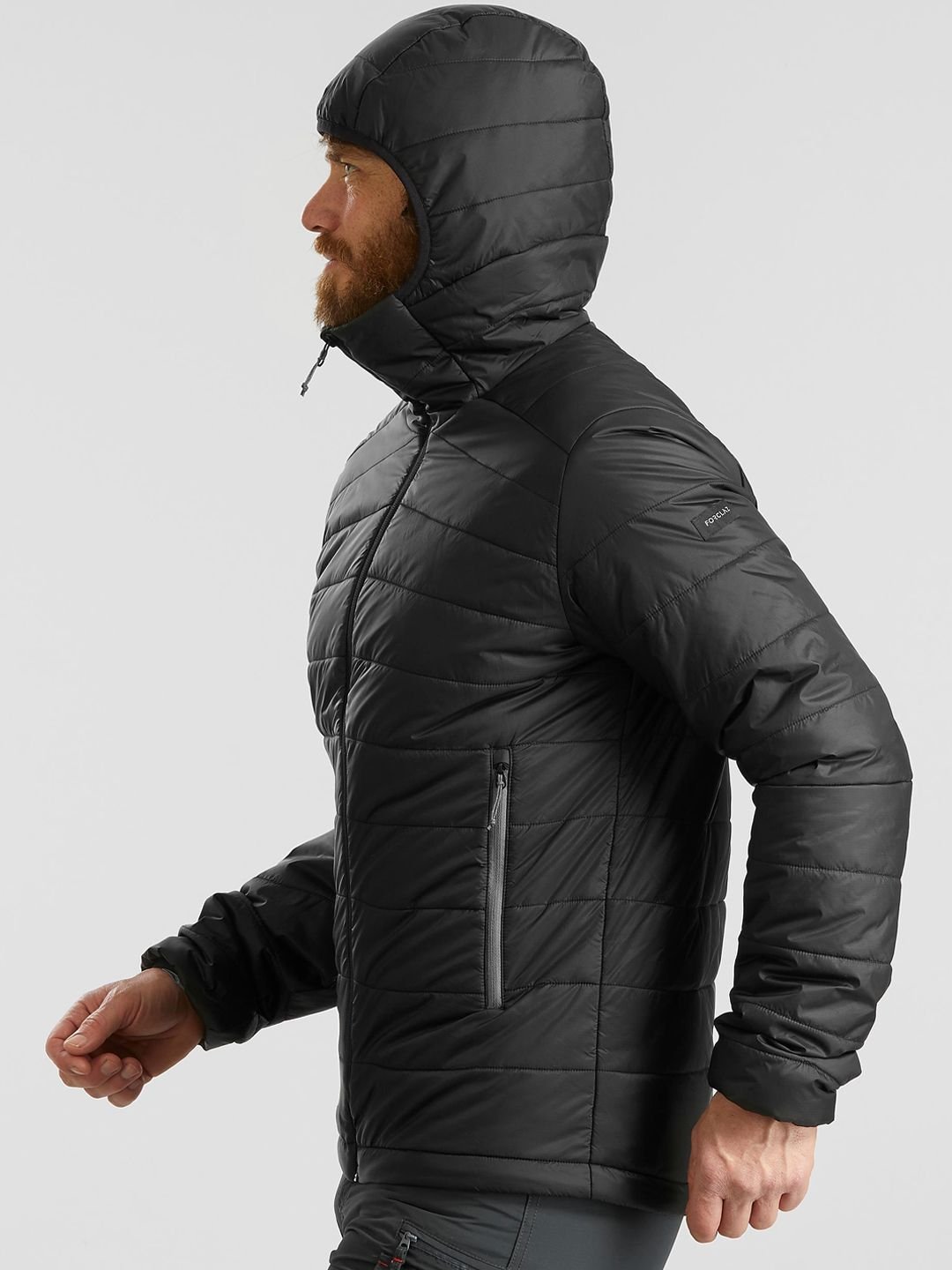 FORCLAZ by Decathlon Men Solid Black Hooded Synthetic Puffer Jacket offers warmth up to -5°C, lightweight insulation, and durable protection.
