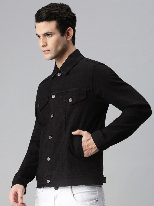 Black washed solid denim jacket, has a spread collar, 2 pockets, has a button closure, long sleeves, straight hemline, without lining