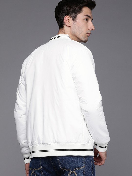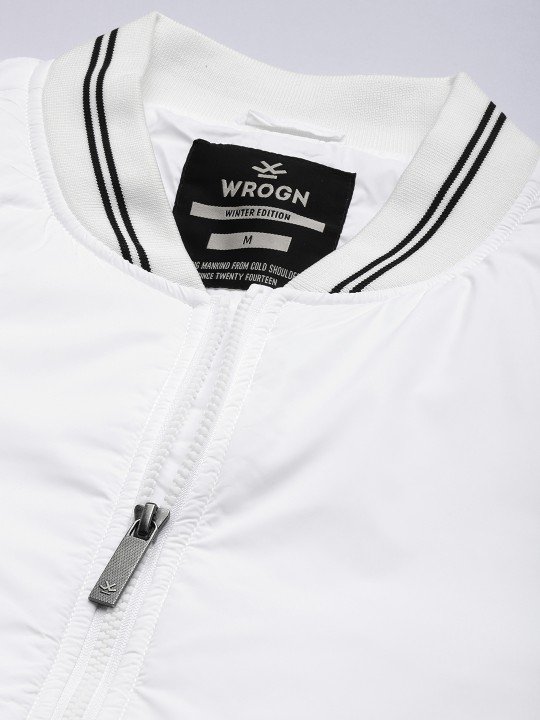 WROGN Men's White Slim Fit Varsity Jacket combines sleek style and comfort, featuring a modern solid design for trendy appeal.