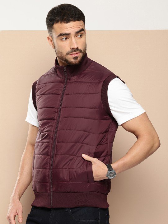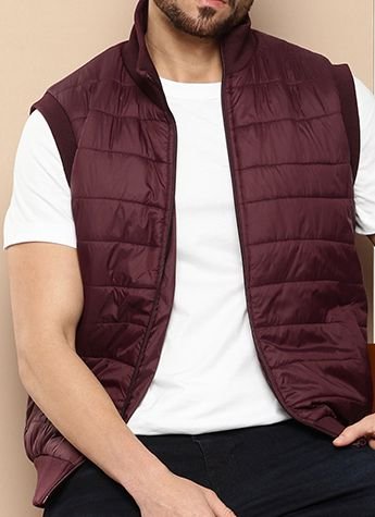 Burgundy solid padded jacket, has a mock collar, 2 pockets ,has a zip closure, sleeveless, straight hemline, polyester lining