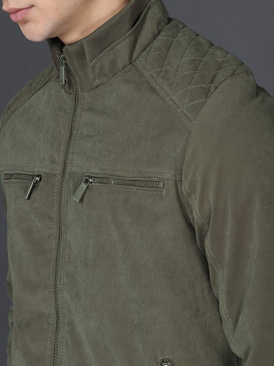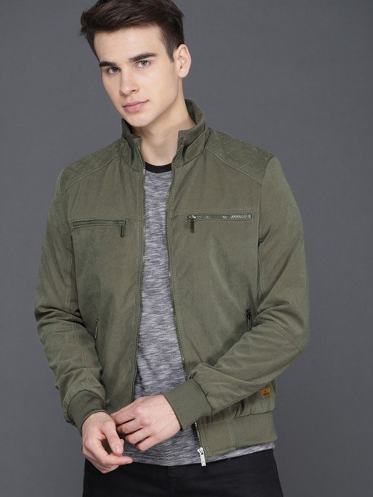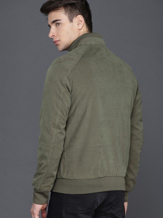 WROGN Men Olive Green Solid Bomber Jacket offers a trendy design, comfortable fit, durable fabric, and a versatile, casual style.