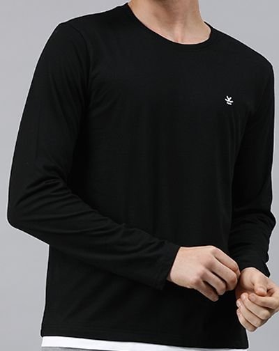 Black solid T-shirt, has a round neck, and long sleeves