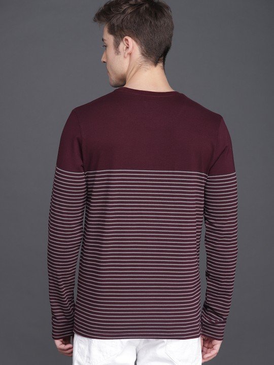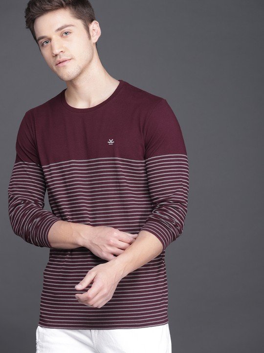 WROGN men's maroon and charcoal grey slim-fit striped T-shirt, made from pure cotton, combines style, comfort, and a modern look.